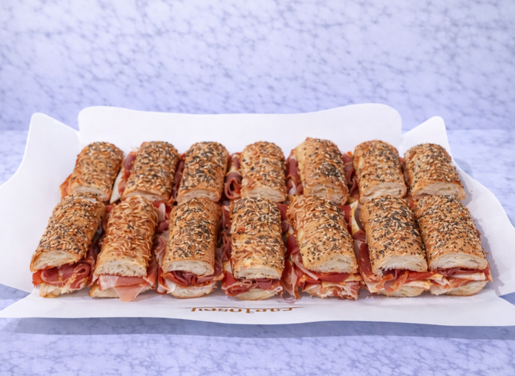 Flautí decorat amb formatge gratinat o amb llavors. Pernil Ibèric. Pa amb tomàquet.