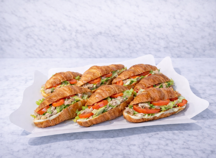 Croissants amb: Base de maionesa, mesclum d‘enciam, rodanxes de tomàquet, tonyina i olives.